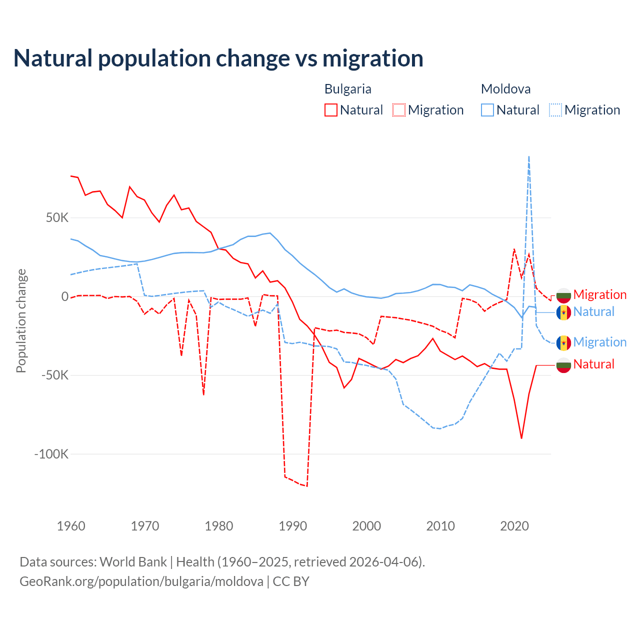 Over the last 10 years, 92.1% of the population change in Bulgaria is from natural causes (a loss of 528,535 people) and 7.94% is from migration (a gain of 45,567 people). In Moldova 6.04% is from natural causes (a loss of 19,001 people) and 94% is from migration (a loss of 295,631 people).