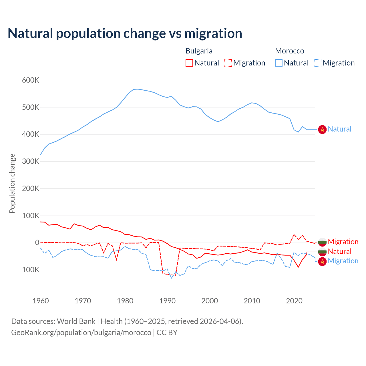 Over the last 10 years, 92.1% of the population change in Bulgaria is from natural causes (a loss of 528,535 people) and 7.94% is from migration (a gain of 45,567 people). In Morocco 88.3% is from natural causes (a gain of 4,495,223 people) and 11.7% is from migration (a loss of 594,083 people).