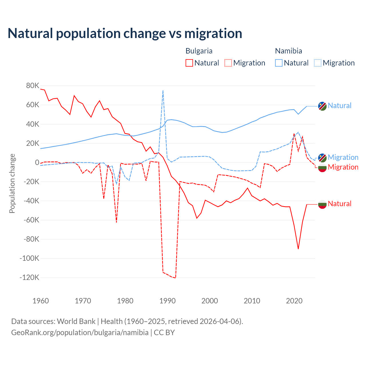 Over the last 10 years, 92.1% of the population change in Bulgaria is from natural causes (a loss of 528,535 people) and 7.94% is from migration (a gain of 45,567 people). In Namibia 74.3% is from natural causes (a gain of 532,532 people) and 25.7% is from migration (a gain of 183,837 people).