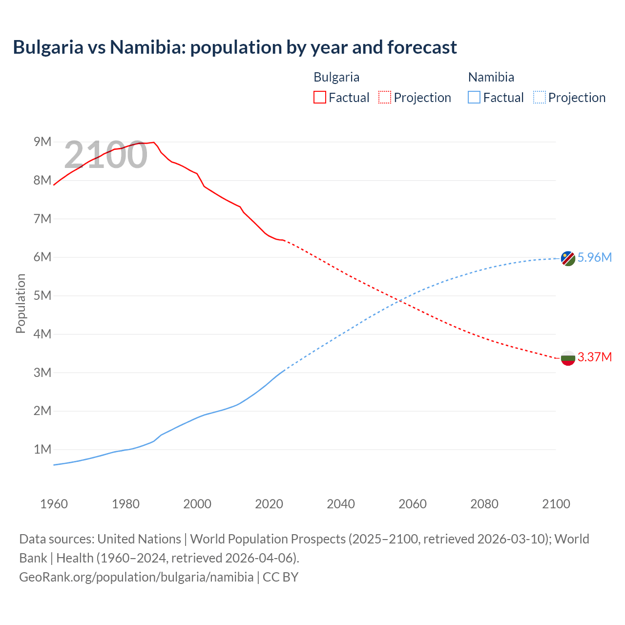 - Since 2006, the population of Bulgaria has decreased from 7.6M people to 6.36M (16.3% decline), while Namibia has grown from 1.99M to 3.17M (59.3% growth).