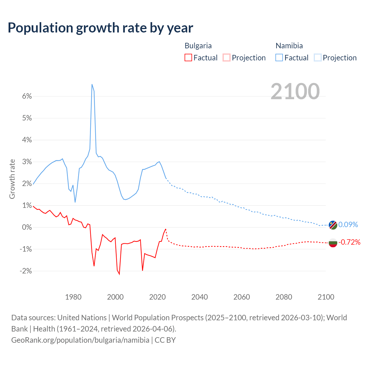 - For the last 10 years, Bulgaria has had an average growth rate of -0.96% per year vs +2.73% in Namibia.