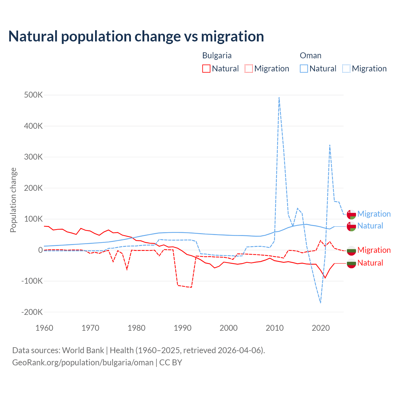 Over the last 10 years, 92.1% of the population change in Bulgaria is from natural causes (a loss of 528,535 people) and 7.94% is from migration (a gain of 45,567 people). In Oman 61.6% is from natural causes (a gain of 763,049 people) and 38.4% is from migration (a gain of 475,565 people).