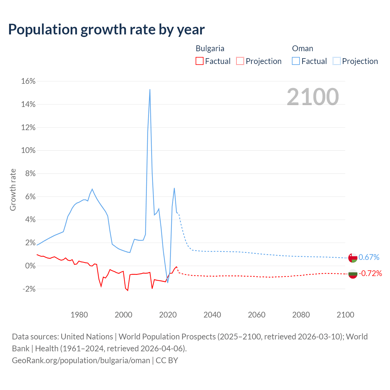 - For the last 10 years, Bulgaria has had an average growth rate of -0.96% per year vs +2.99% in Oman.