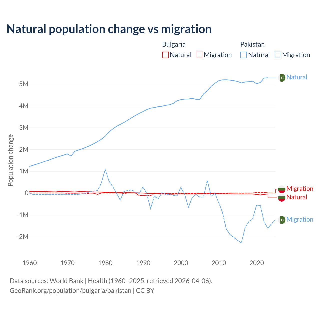 Over the last 10 years, 92.1% of the population change in Bulgaria is from natural causes (a loss of 528,535 people) and 7.94% is from migration (a gain of 45,567 people). In Pakistan 77.8% is from natural causes (a gain of 51,255,404 people) and 22.2% is from migration (a loss of 14,629,055 people).