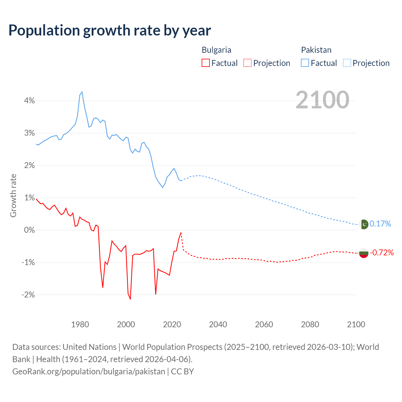 - For the last 10 years, Bulgaria has had an average growth rate of -0.96% per year vs +1.6% in Pakistan.