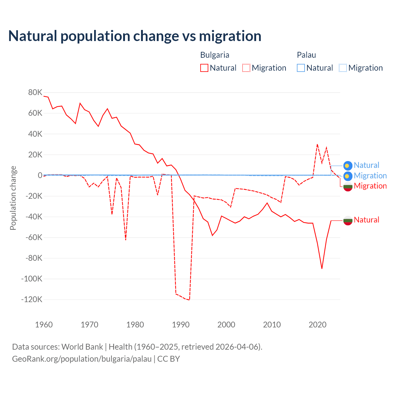 Over the last 10 years, 92.1% of the population change in Bulgaria is from natural causes (a loss of 528,535 people) and 7.94% is from migration (a gain of 45,567 people). In Palau 53.8% is from natural causes (a gain of 264 people) and 46.2% is from migration (a loss of 227 people).