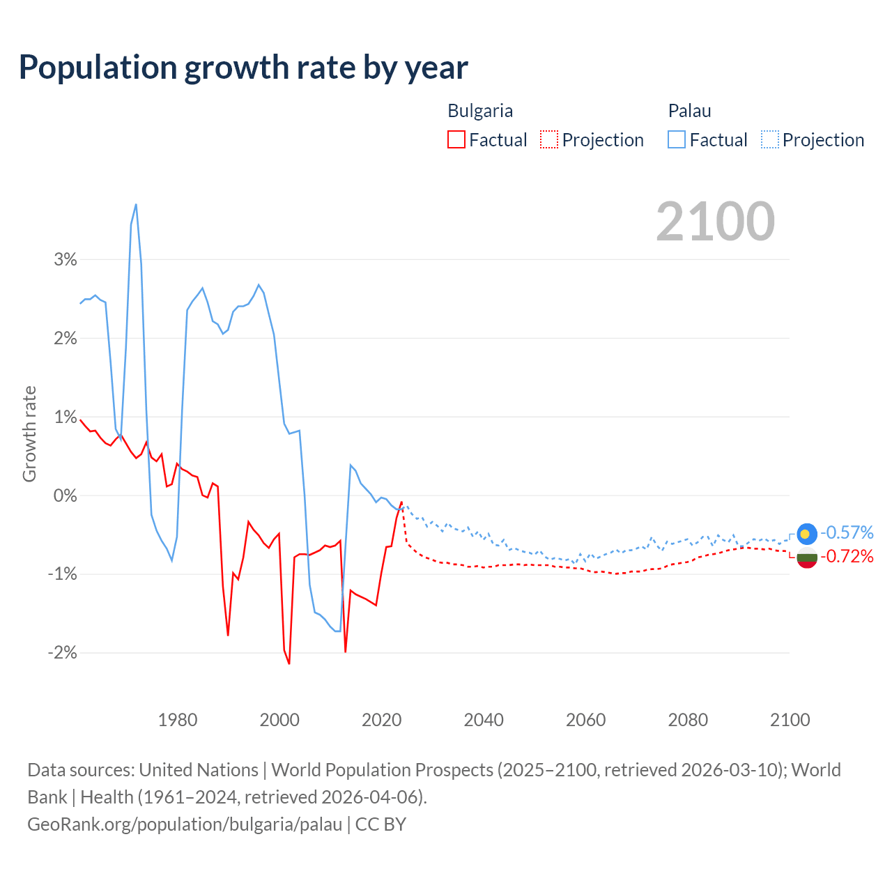- For the last 10 years, Bulgaria has had an average growth rate of -0.96% per year vs +0.02% in Palau.