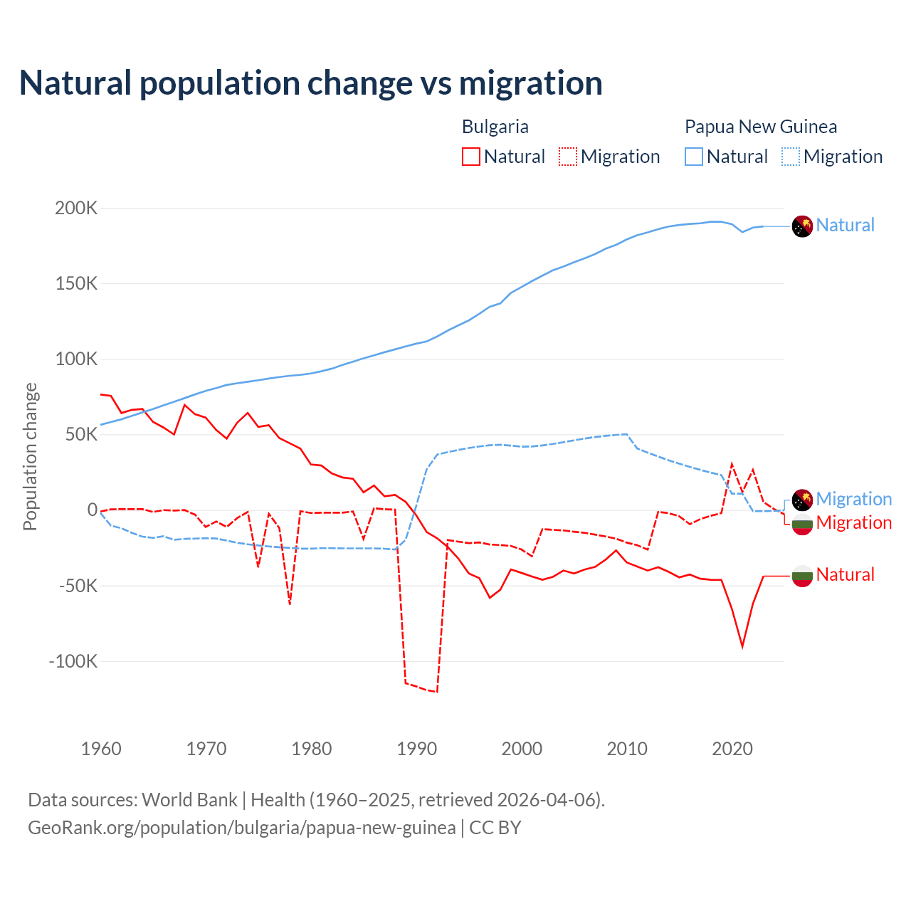 Over the last 10 years, 92.1% of the population change in Bulgaria is from natural causes (a loss of 528,535 people) and 7.94% is from migration (a gain of 45,567 people). In Papua New Guinea 91% is from natural causes (a gain of 1,883,906 people) and 8.98% is from migration (a gain of 185,900 people).