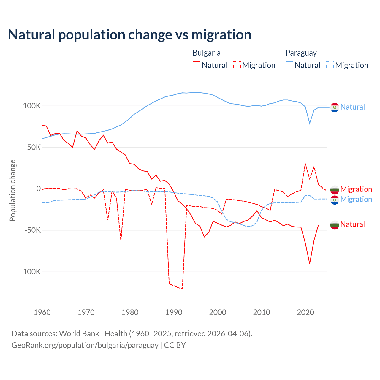 Over the last 10 years, 92.1% of the population change in Bulgaria is from natural causes (a loss of 528,535 people) and 7.94% is from migration (a gain of 45,567 people). In Paraguay 87.6% is from natural causes (a gain of 1,002,636 people) and 12.4% is from migration (a loss of 141,377 people).