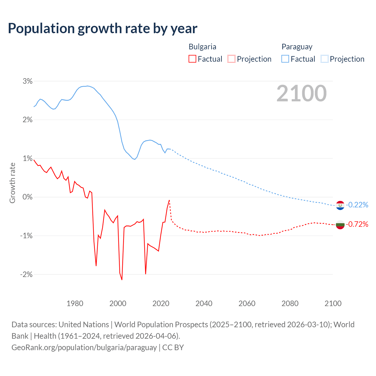 - For the last 10 years, Bulgaria has had an average growth rate of -0.96% per year vs +1.34% in Paraguay.