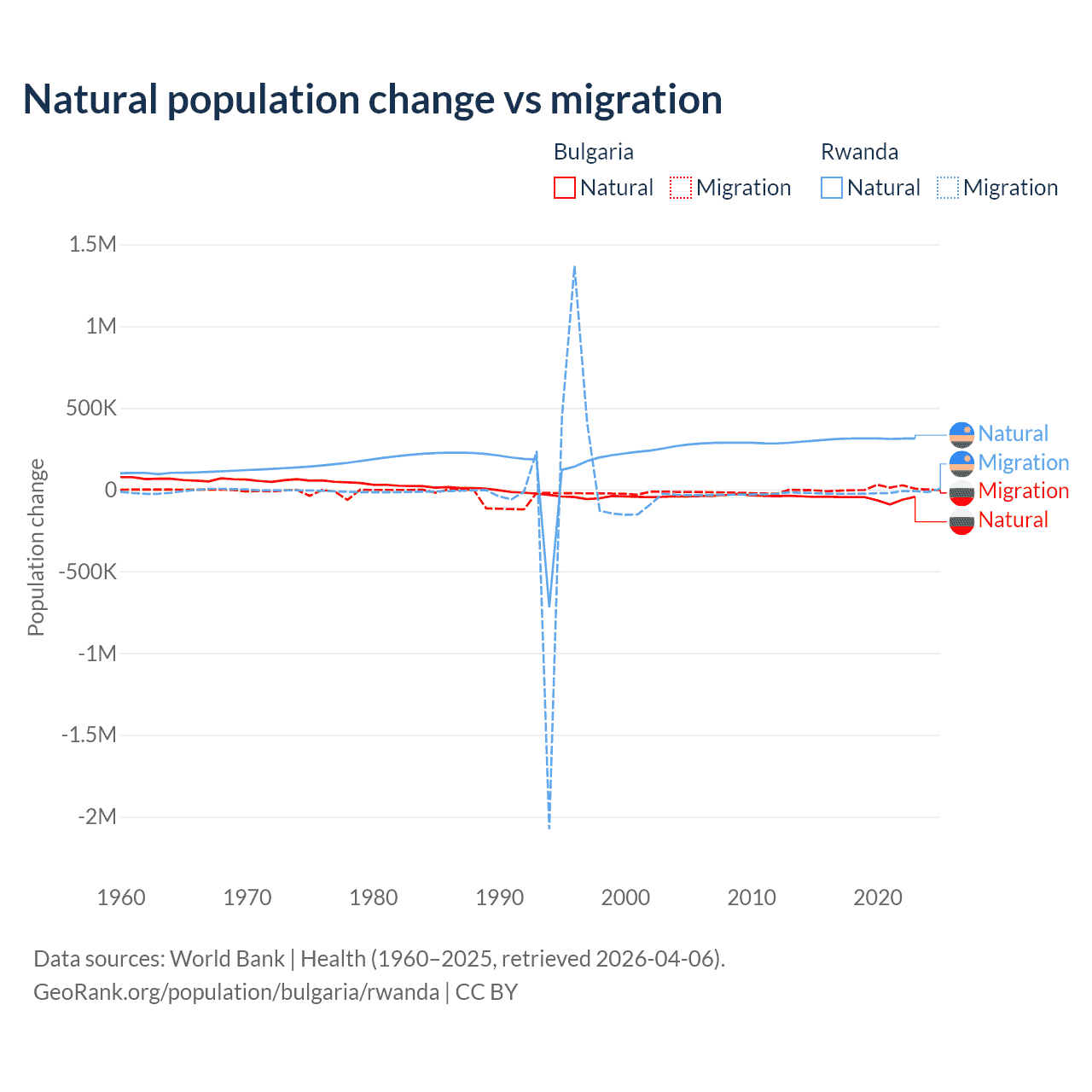 Over the last 10 years, 92.1% of the population change in Bulgaria is from natural causes (a loss of 528,535 people) and 7.94% is from migration (a gain of 45,567 people). In Rwanda 93.8% is from natural causes (a gain of 3,081,296 people) and 6.18% is from migration (a loss of 203,035 people).