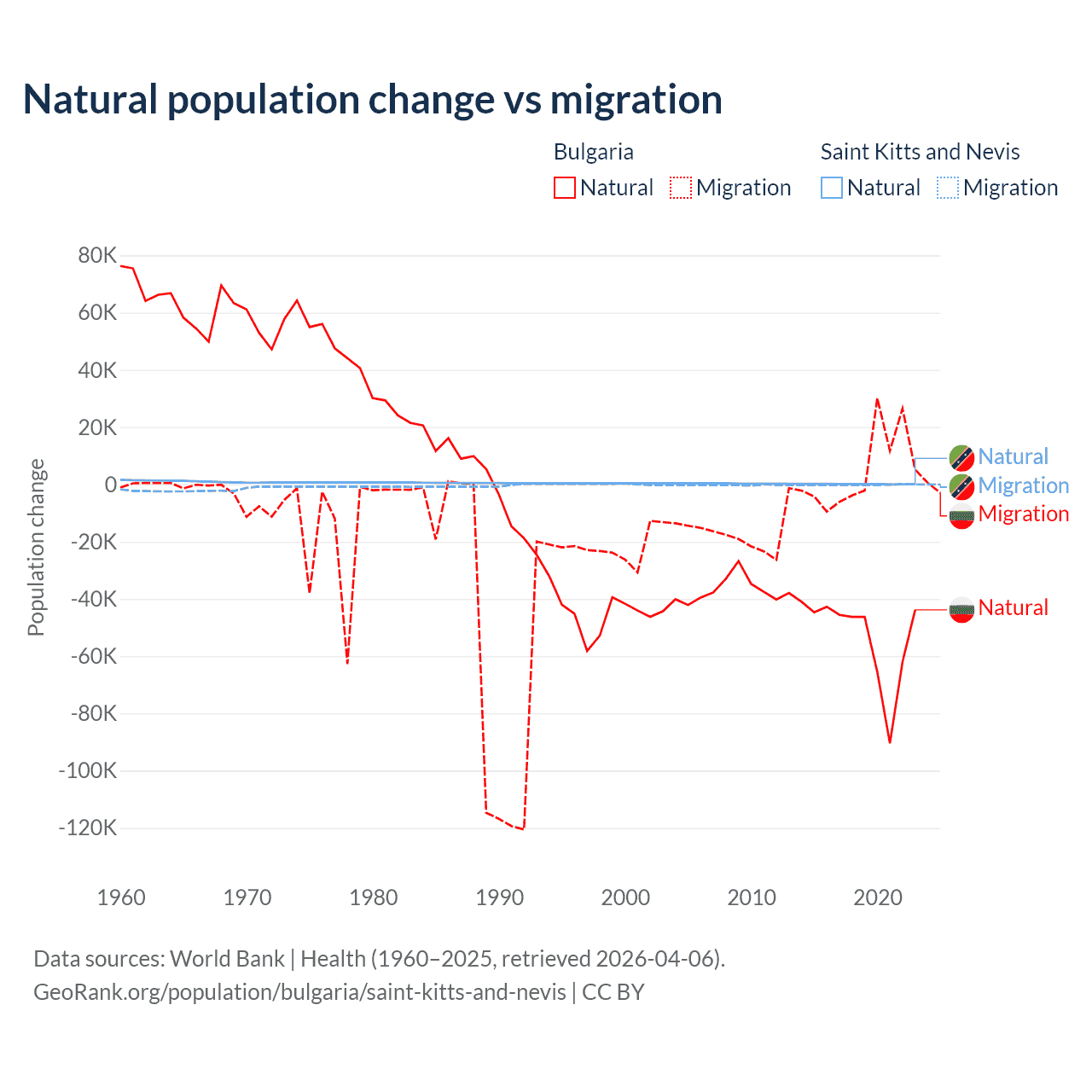 Over the last 10 years, 92.1% of the population change in Bulgaria is from natural causes (a loss of 528,535 people) and 7.94% is from migration (a gain of 45,567 people). In Saint Kitts and Nevis 44.9% is from natural causes (a gain of 1,225 people) and 55.1% is from migration (a loss of 1,506 people).
