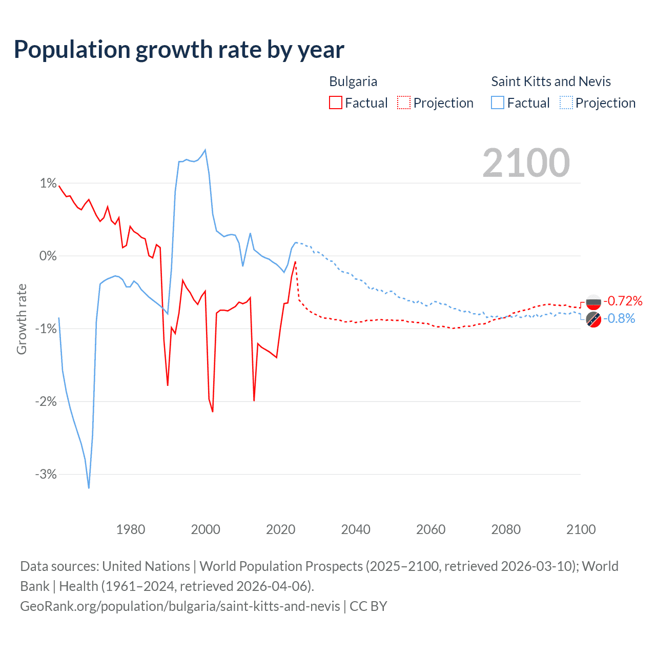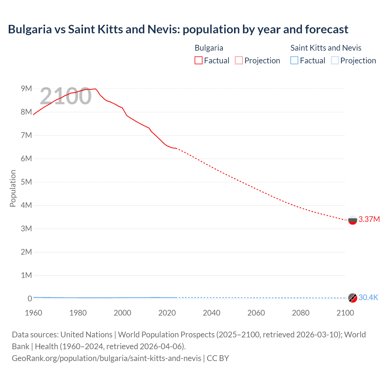 Bulgaria vs Saint Kitts and Nevis: population by year and forecast