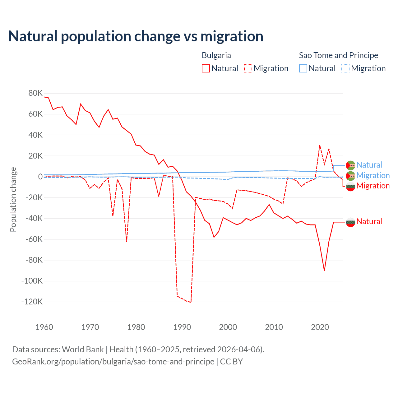 Over the last 10 years, 92.1% of the population change in Bulgaria is from natural causes (a loss of 528,535 people) and 7.94% is from migration (a gain of 45,567 people). In Sao Tome and Principe 80.1% is from natural causes (a gain of 50,822 people) and 19.9% is from migration (a loss of 12,621 people).