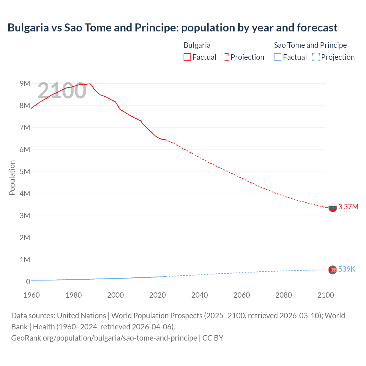 Bulgaria vs Sao Tome and Principe: population by year and forecast