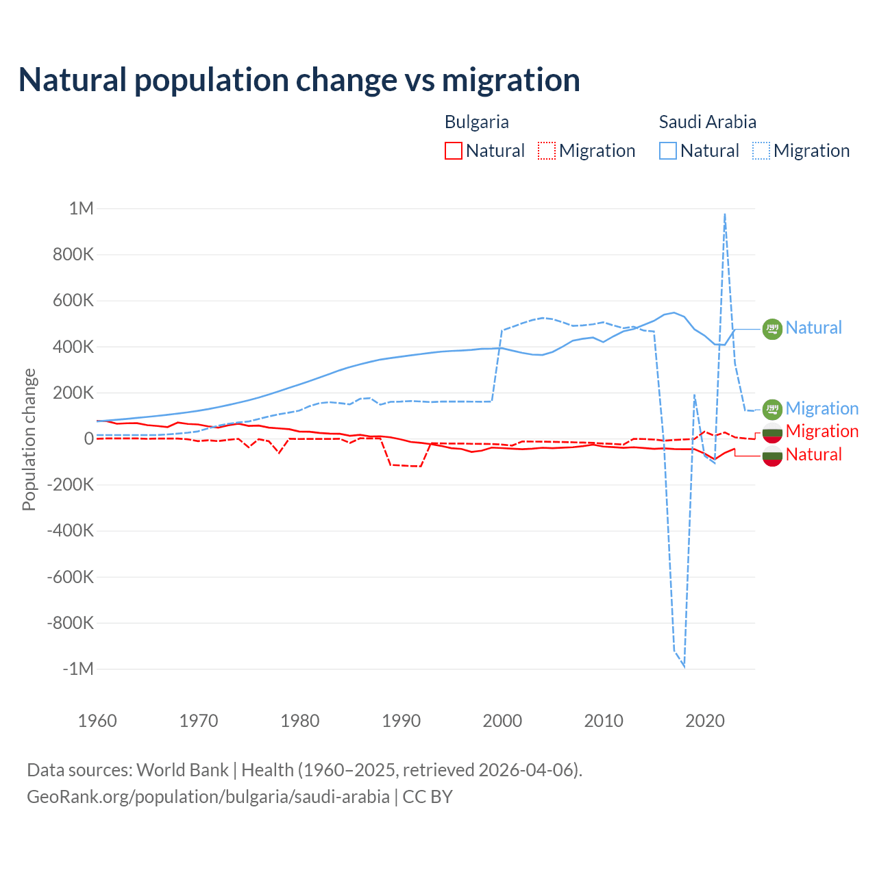 Over the last 10 years, 92.1% of the population change in Bulgaria is from natural causes (a loss of 528,535 people) and 7.94% is from migration (a gain of 45,567 people). In Saudi Arabia 93.9% is from natural causes (a gain of 4,829,562 people) and 6.05% is from migration (a gain of 311,209 people).