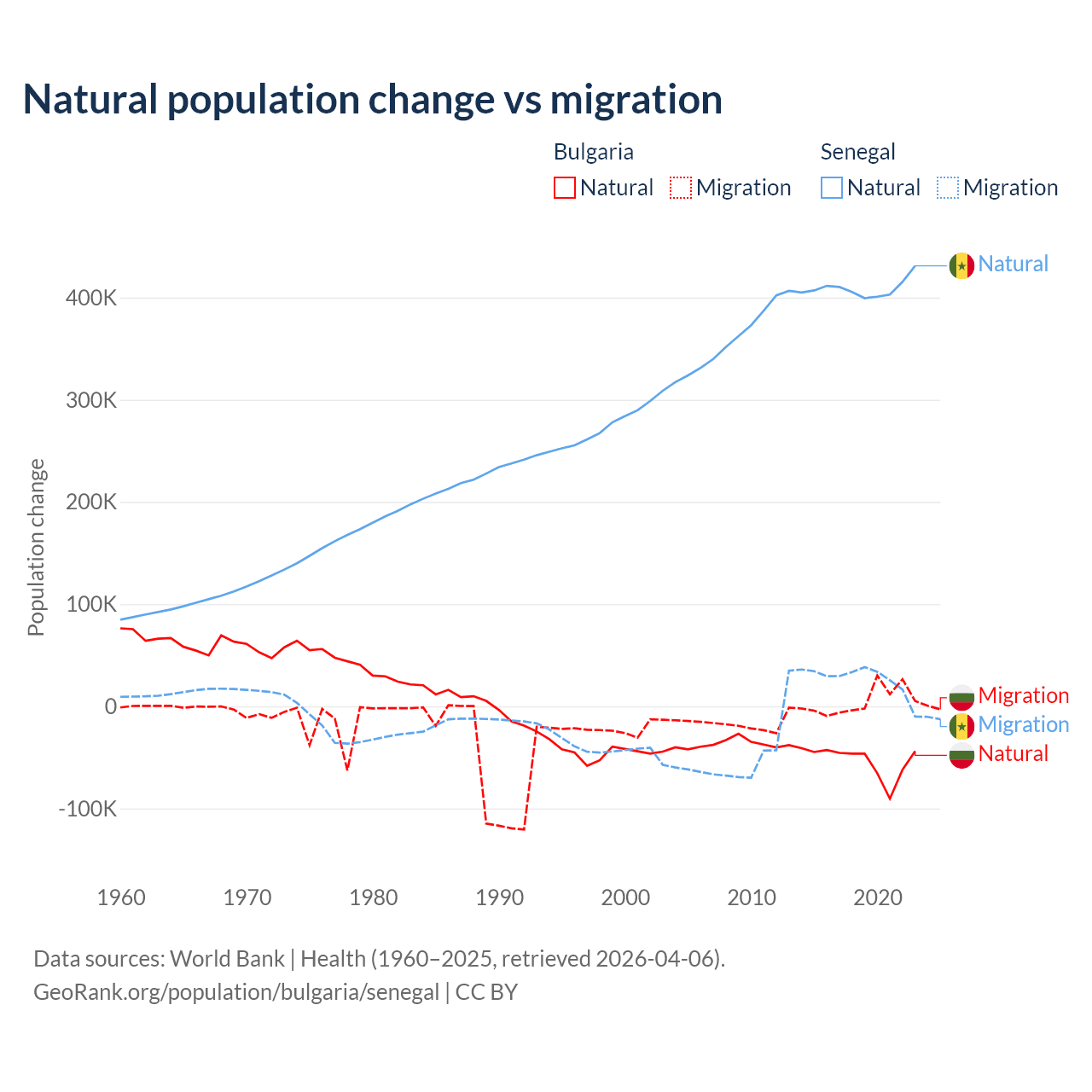 Over the last 10 years, 92.1% of the population change in Bulgaria is from natural causes (a loss of 528,535 people) and 7.94% is from migration (a gain of 45,567 people). In Senegal 93.9% is from natural causes (a gain of 4,089,205 people) and 6.13% is from migration (a gain of 267,266 people).