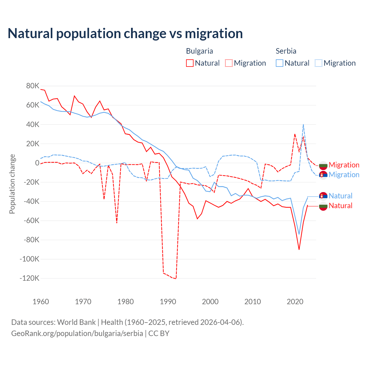 Over the last 10 years, 92.1% of the population change in Bulgaria is from natural causes (a loss of 528,535 people) and 7.94% is from migration (a gain of 45,567 people). In Serbia 83.3% is from natural causes (a loss of 435,148 people) and 16.7% is from migration (a loss of 87,110 people).