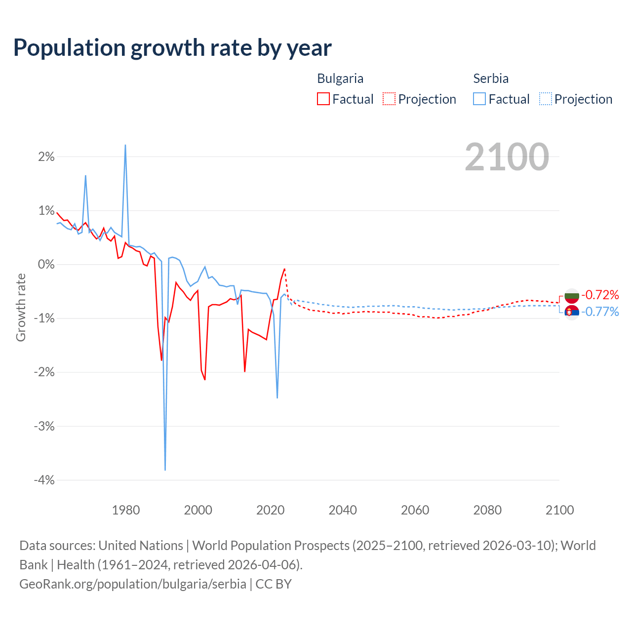 - For the last 10 years, Bulgaria has had an average growth rate of -0.96% per year vs -0.76% in Serbia.