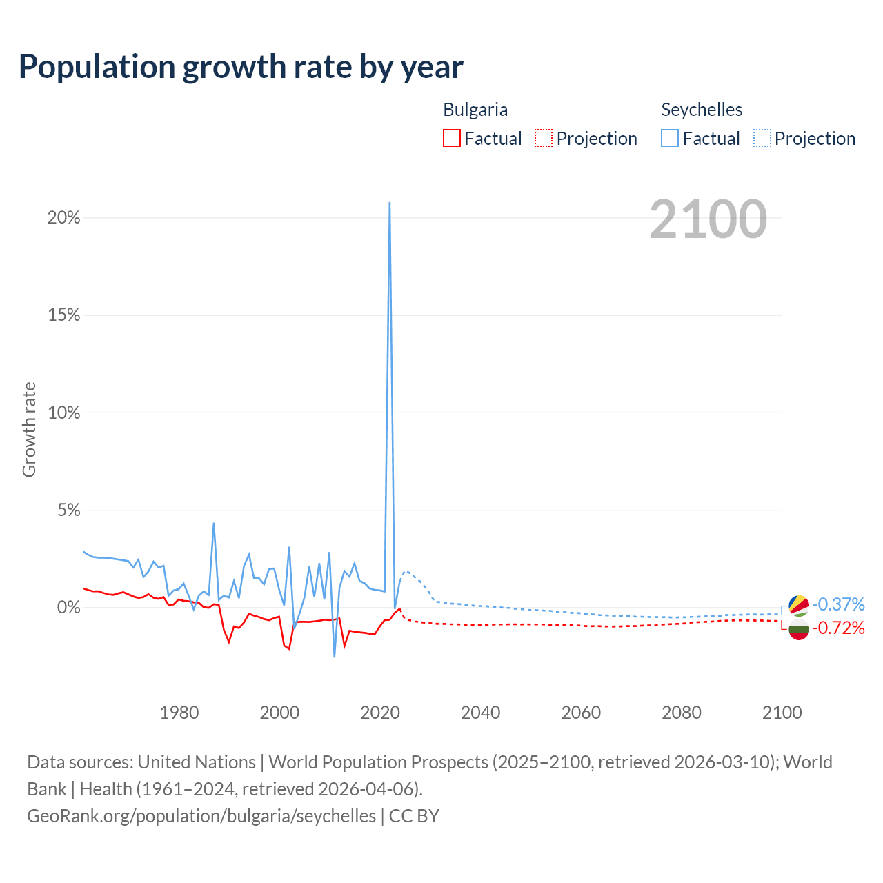 Bulgaria vs Seychelles: population by year and forecast