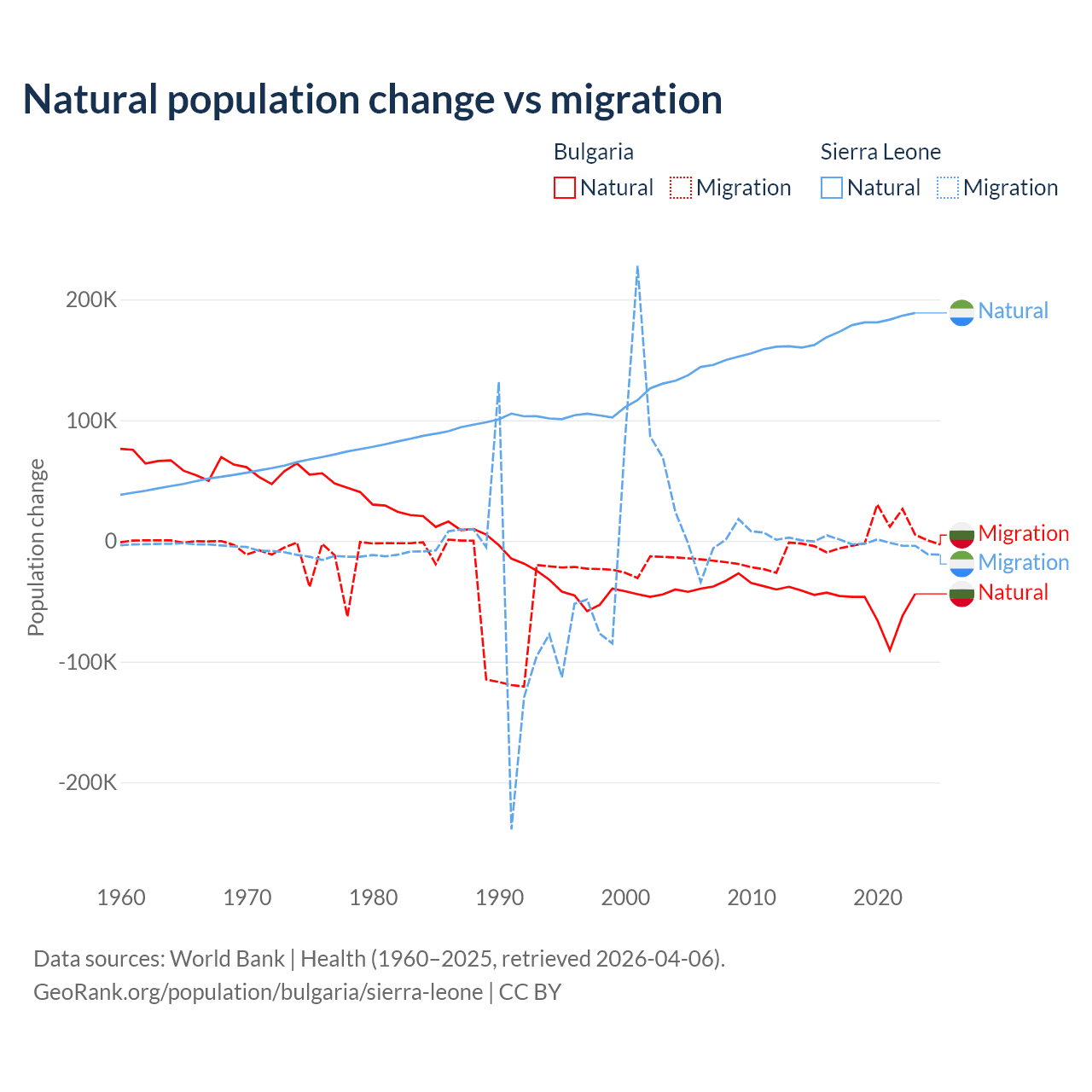 Over the last 10 years, 92.1% of the population change in Bulgaria is from natural causes (a loss of 528,535 people) and 7.94% is from migration (a gain of 45,567 people). In Sierra Leone 99.6% is from natural causes (a gain of 1,764,049 people) and 0.41% is from migration (a loss of 7,211 people).