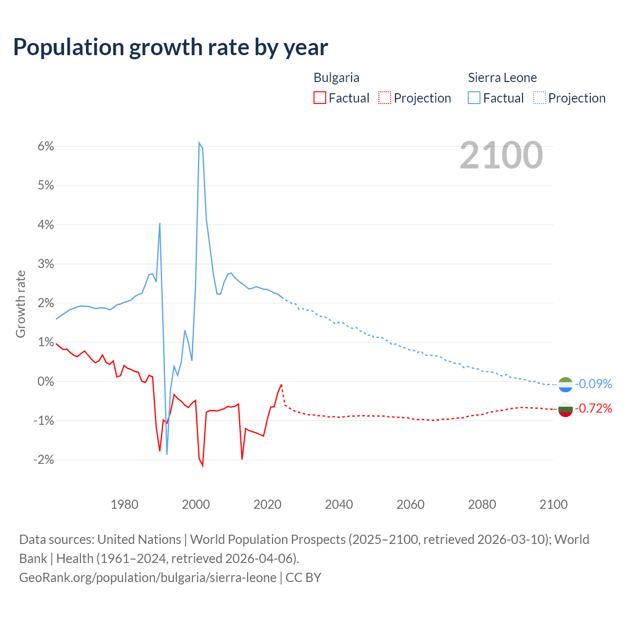 - For the last 10 years, Bulgaria has had an average growth rate of -0.96% per year vs +2.32% in Sierra Leone.
