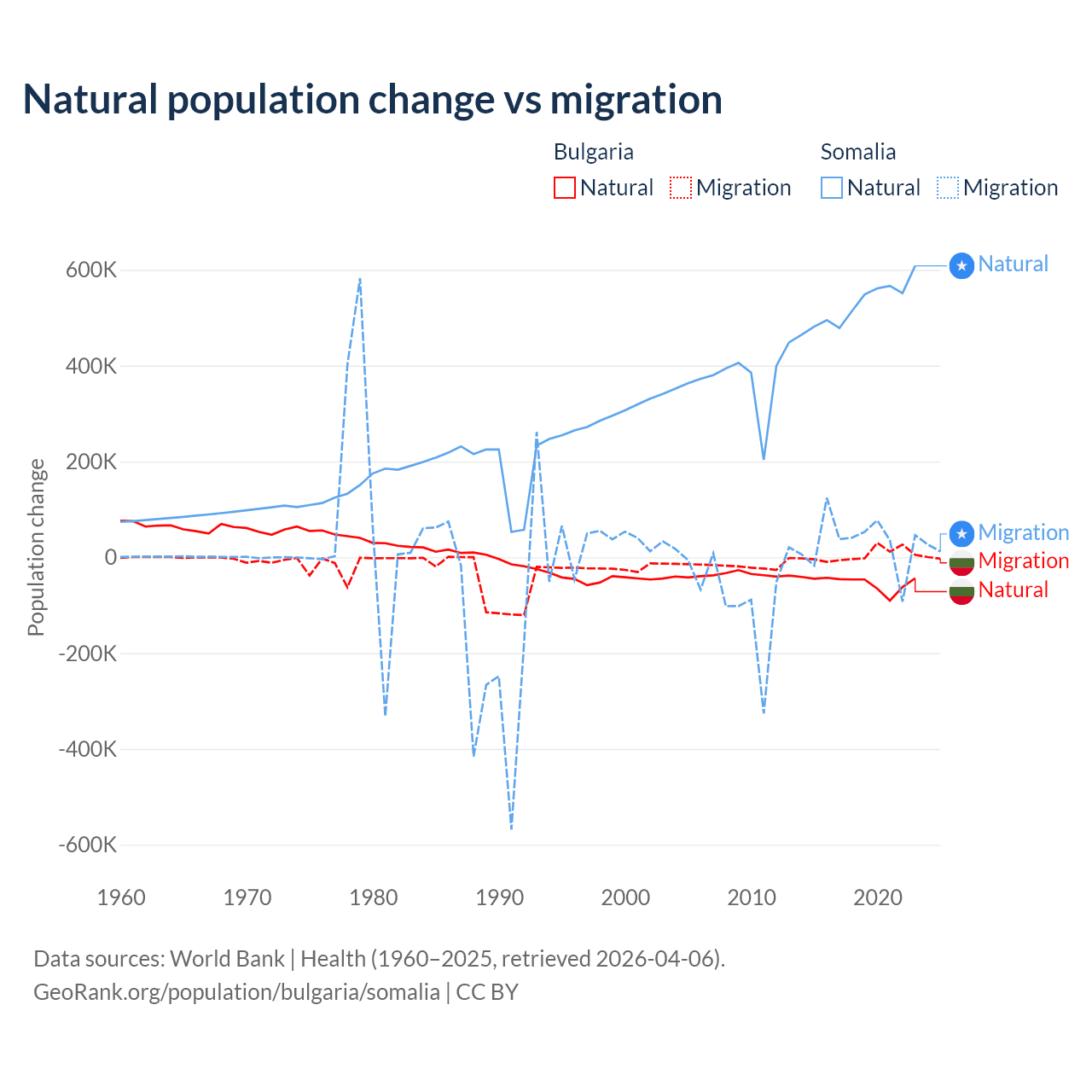 Over the last 10 years, 92.1% of the population change in Bulgaria is from natural causes (a loss of 528,535 people) and 7.94% is from migration (a gain of 45,567 people). In Somalia 94.4% is from natural causes (a gain of 5,270,105 people) and 5.58% is from migration (a gain of 311,487 people).