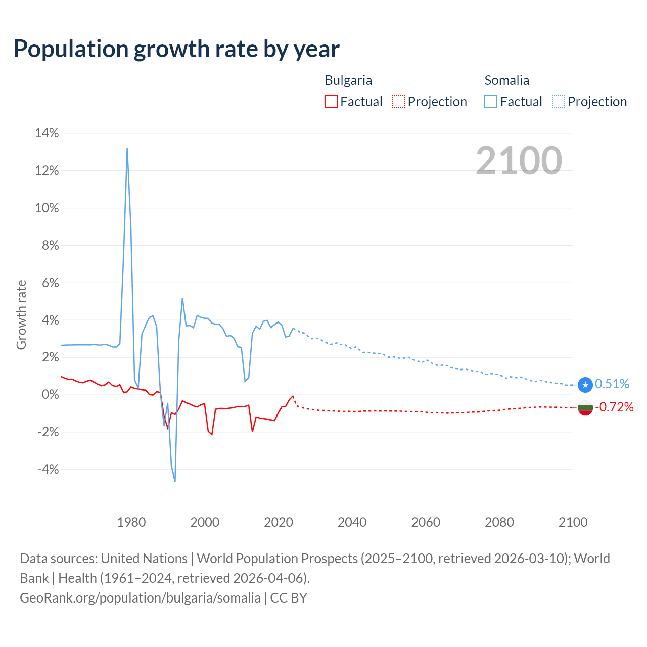 - For the last 10 years, Bulgaria has had an average growth rate of -0.96% per year vs +3.61% in Somalia.