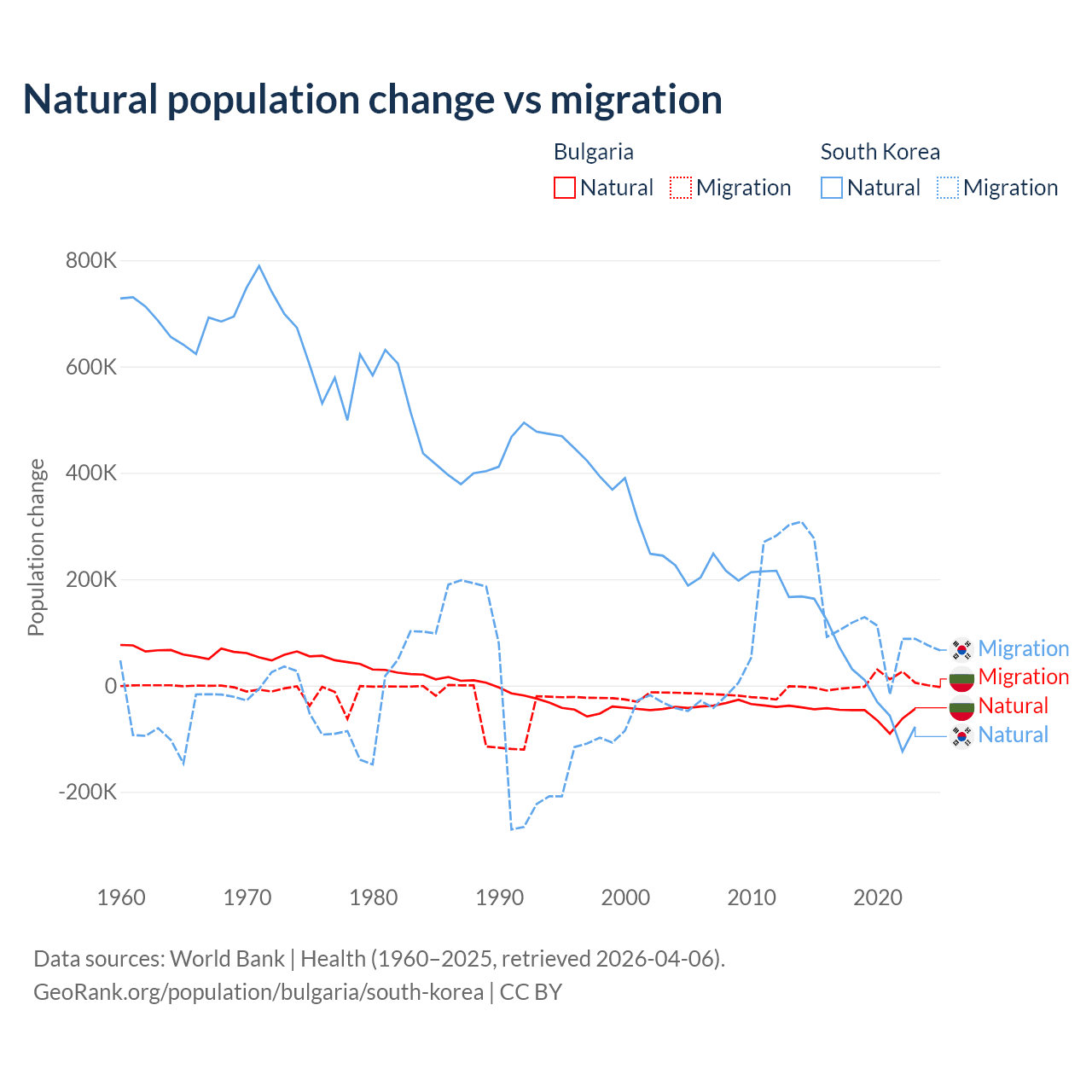 Over the last 10 years, 92.1% of the population change in Bulgaria is from natural causes (a loss of 528,535 people) and 7.94% is from migration (a gain of 45,567 people). In South Korea 17.6% is from natural causes (a gain of 277,215 people) and 82.4% is from migration (a gain of 1,298,356 people).