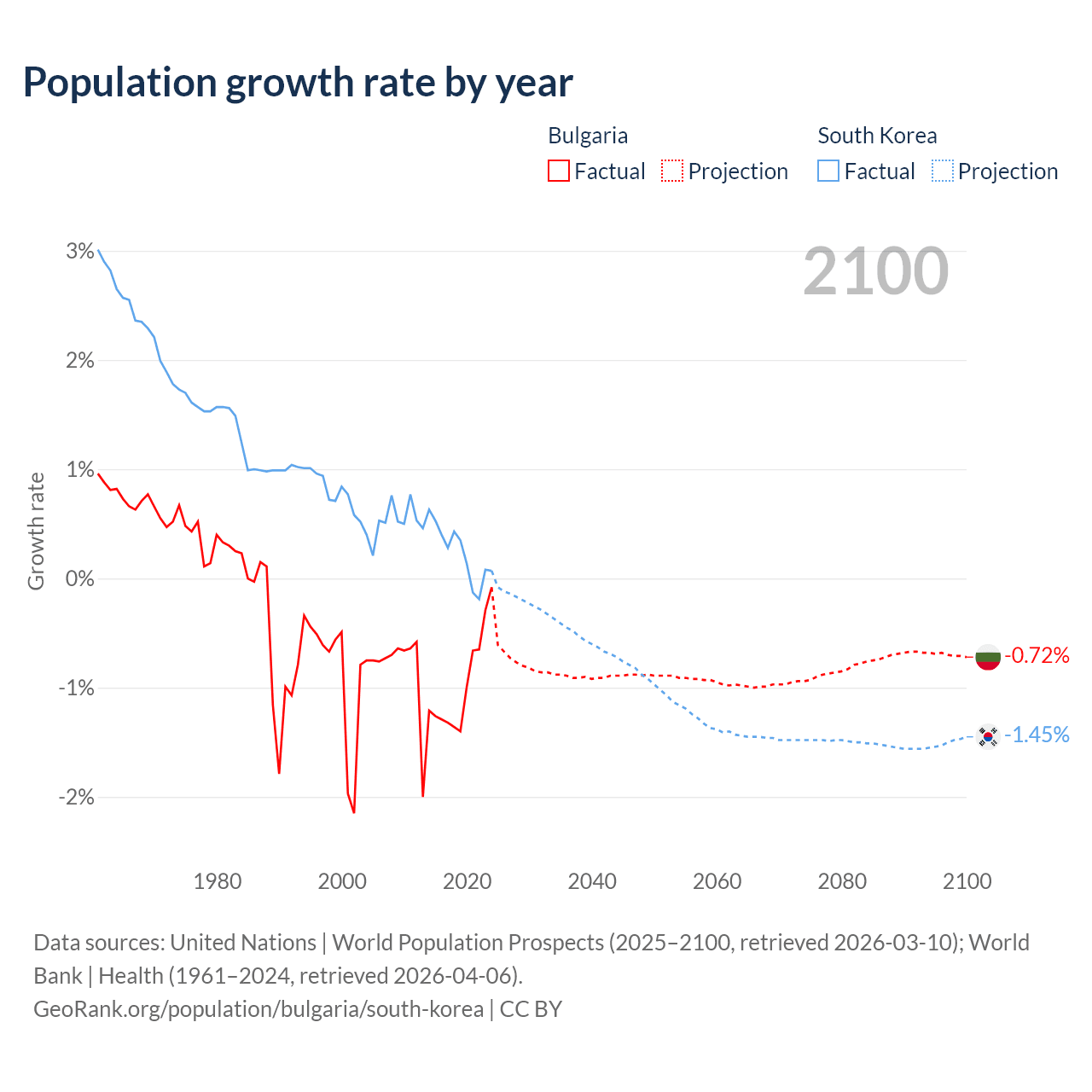 - For the last 10 years, Bulgaria has had an average growth rate of -0.96% per year vs +0.24% in South Korea.