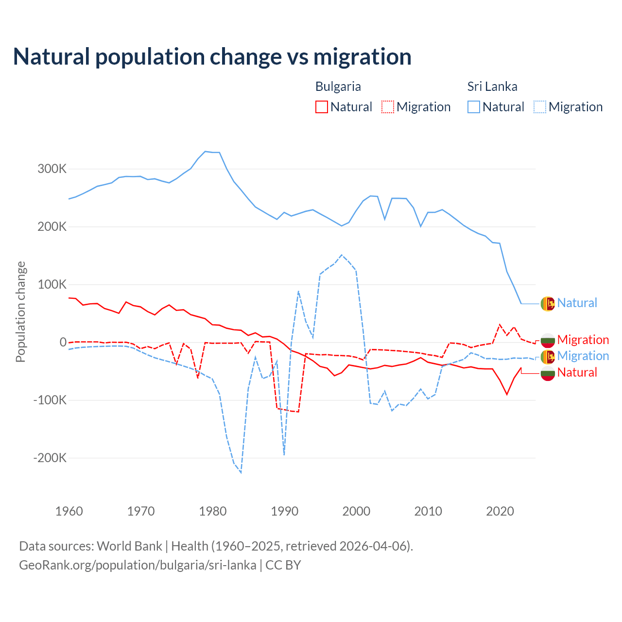 Over the last 10 years, 92.1% of the population change in Bulgaria is from natural causes (a loss of 528,535 people) and 7.94% is from migration (a gain of 45,567 people). In Sri Lanka 85.3% is from natural causes (a gain of 1,605,749 people) and 14.7% is from migration (a loss of 276,121 people).
