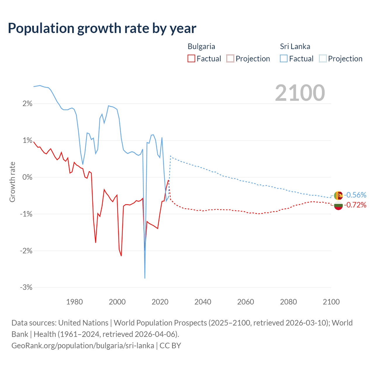 - For the last 10 years, Bulgaria has had an average growth rate of -0.96% per year vs +0.57% in Sri Lanka.