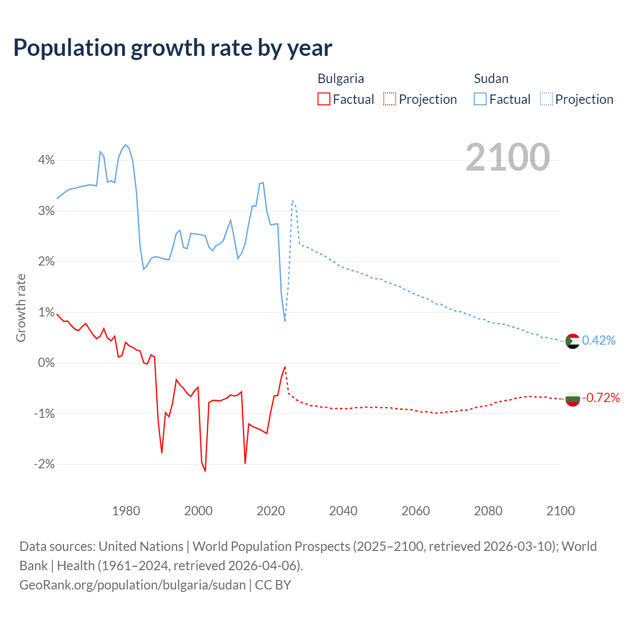 - For the last 10 years, Bulgaria has had an average growth rate of -0.96% per year vs +2.67% in Sudan.