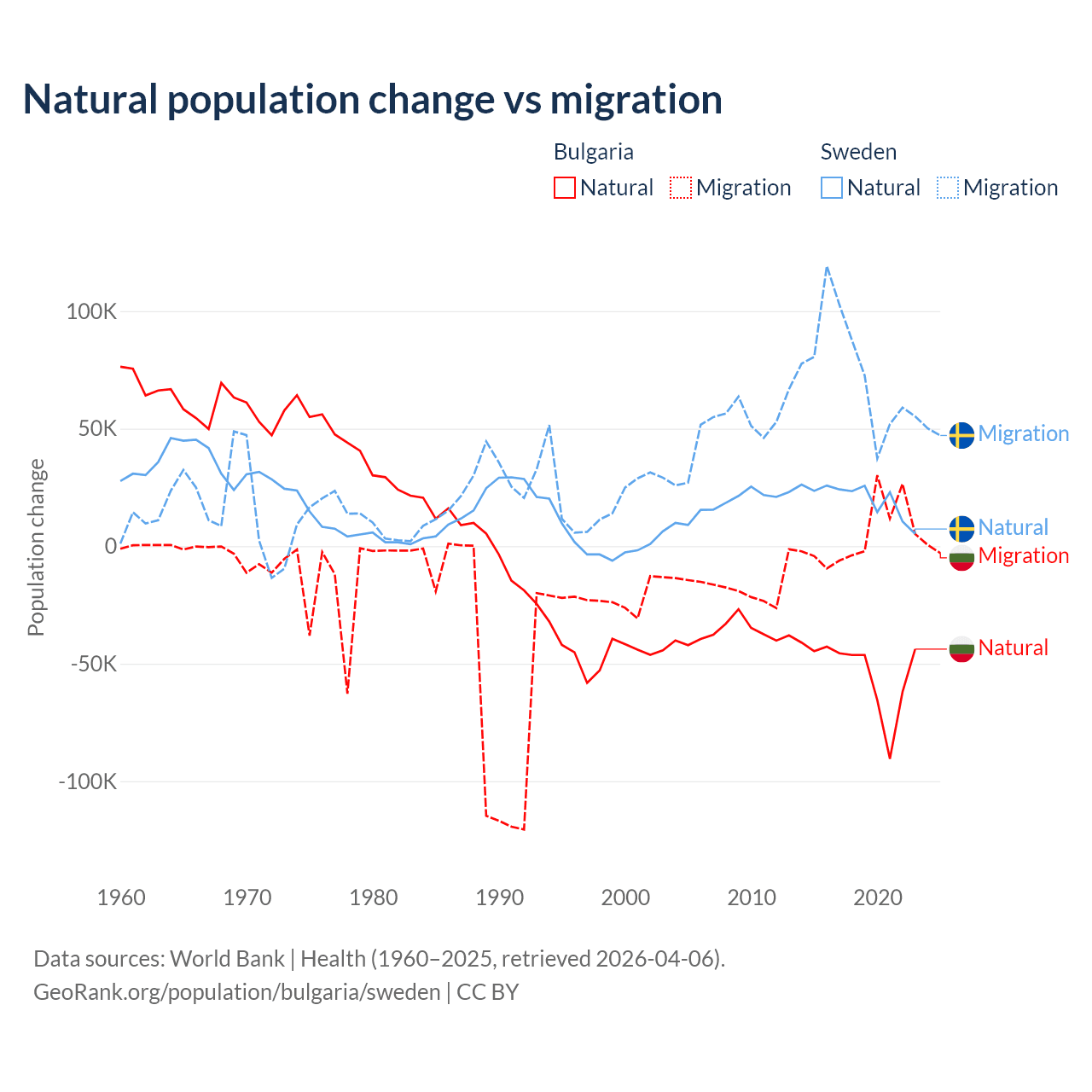 Over the last 10 years, 92.1% of the population change in Bulgaria is from natural causes (a loss of 528,535 people) and 7.94% is from migration (a gain of 45,567 people). In Sweden 21.4% is from natural causes (a gain of 201,900 people) and 78.6% is from migration (a gain of 743,642 people).