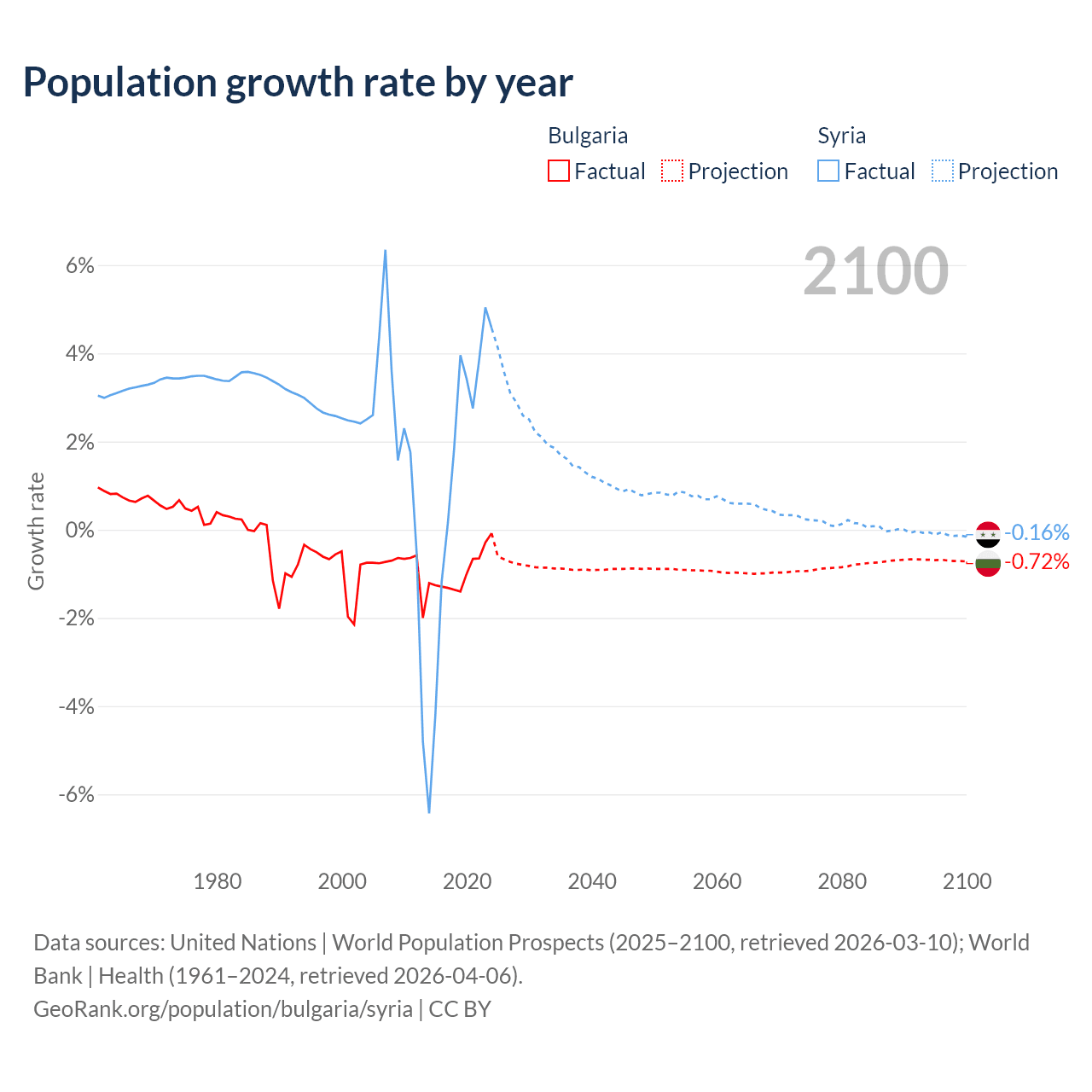 - For the last 10 years, Bulgaria has had an average growth rate of -0.96% per year vs +1.25% in Syria.