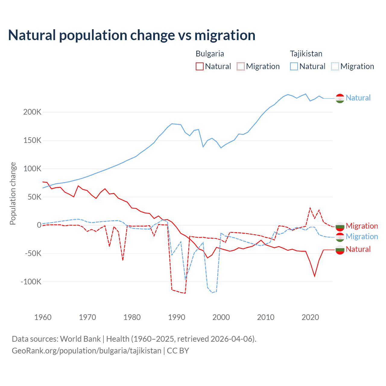 Over the last 10 years, 92.1% of the population change in Bulgaria is from natural causes (a loss of 528,535 people) and 7.94% is from migration (a gain of 45,567 people). In Tajikistan 96% is from natural causes (a gain of 2,266,045 people) and 3.95% is from migration (a loss of 93,205 people).