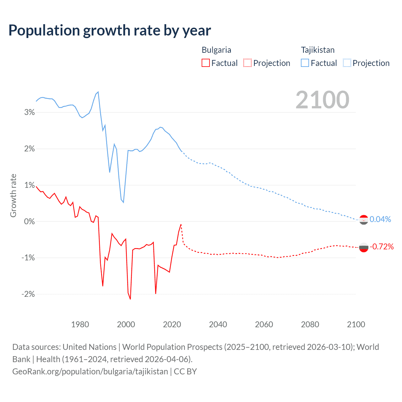 - For the last 10 years, Bulgaria has had an average growth rate of -0.96% per year vs +2.33% in Tajikistan.