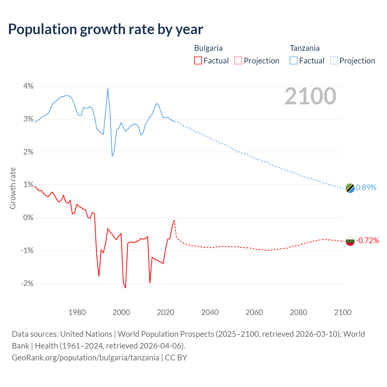 - For the last 10 years, Bulgaria has had an average growth rate of -0.96% per year vs +3.13% in Tanzania.