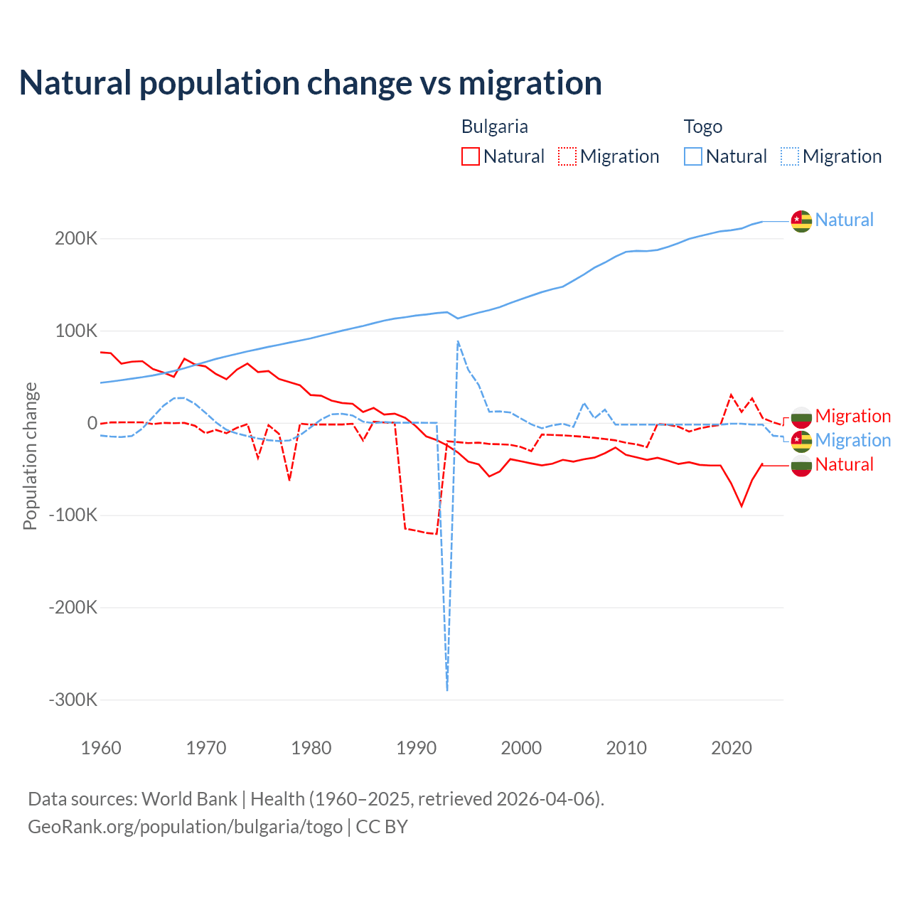 Over the last 10 years, 92.1% of the population change in Bulgaria is from natural causes (a loss of 528,535 people) and 7.94% is from migration (a gain of 45,567 people). In Togo 99.1% is from natural causes (a gain of 2,052,115 people) and 0.86% is from migration (a loss of 17,852 people).