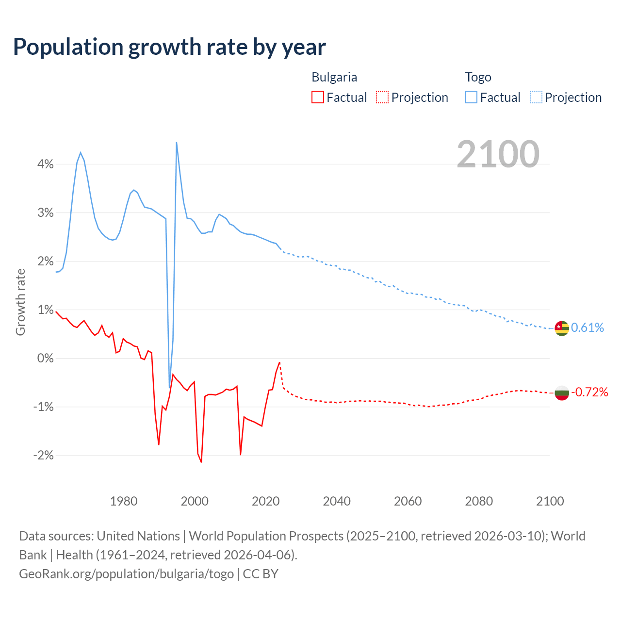 - For the last 10 years, Bulgaria has had an average growth rate of -0.96% per year vs +2.46% in Togo.