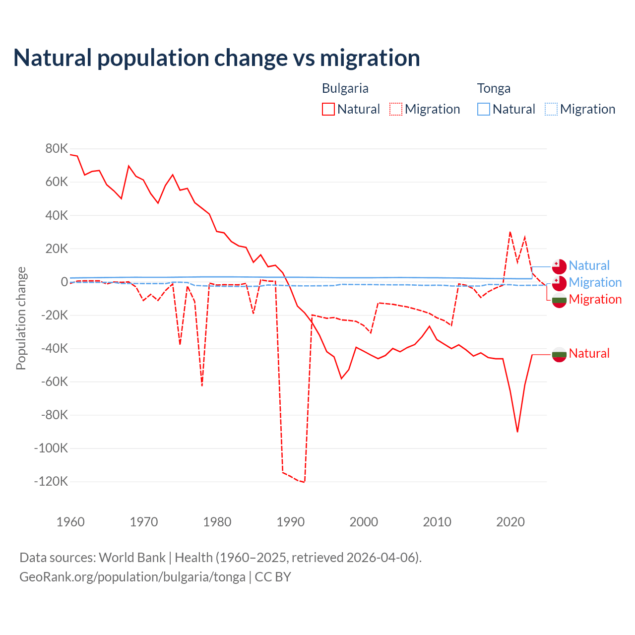 Over the last 10 years, 92.1% of the population change in Bulgaria is from natural causes (a loss of 528,535 people) and 7.94% is from migration (a gain of 45,567 people). In Tonga 46.9% is from natural causes (a gain of 18,919 people) and 53.1% is from migration (a loss of 21,384 people).