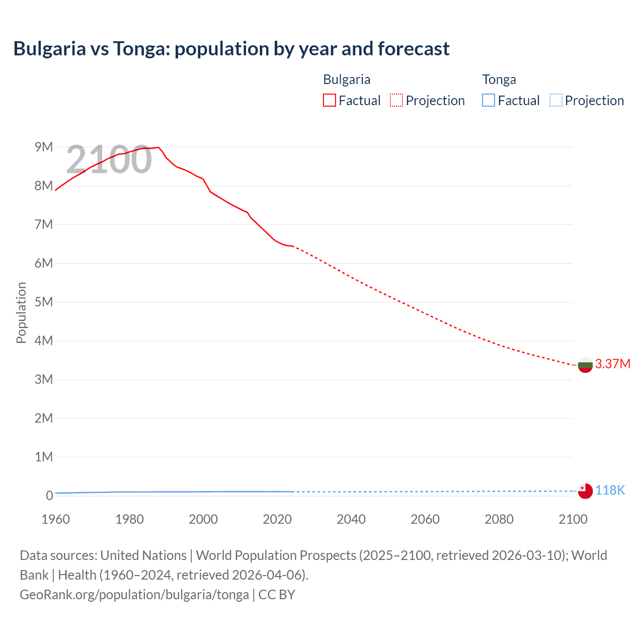 The latest officially reported population of Bulgaria was 6,441,421 in 2024 vs 104,175 people in Tonga in 2024. In 2026, based on the adjusted UN estimation, the current Bulgaria's population is 6,359,449 people compared to 103,309 in Tonga.