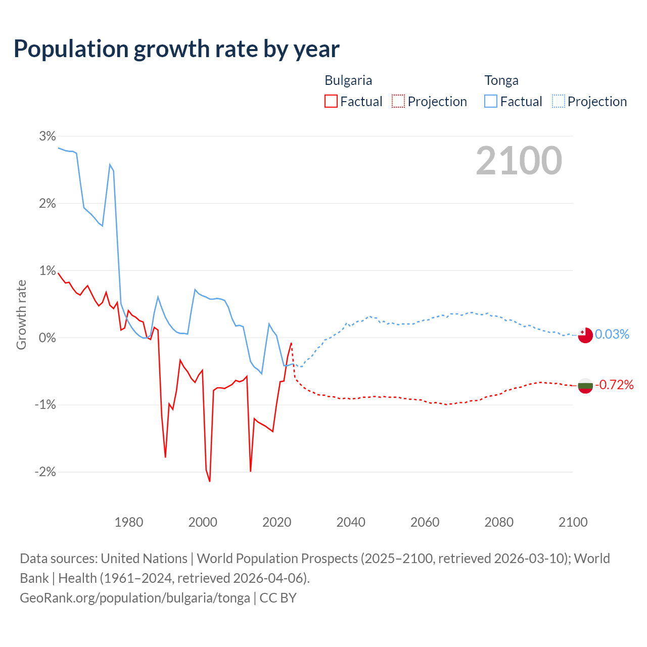 - For the last 10 years, Bulgaria has had an average growth rate of -0.96% per year vs -0.25% in Tonga.