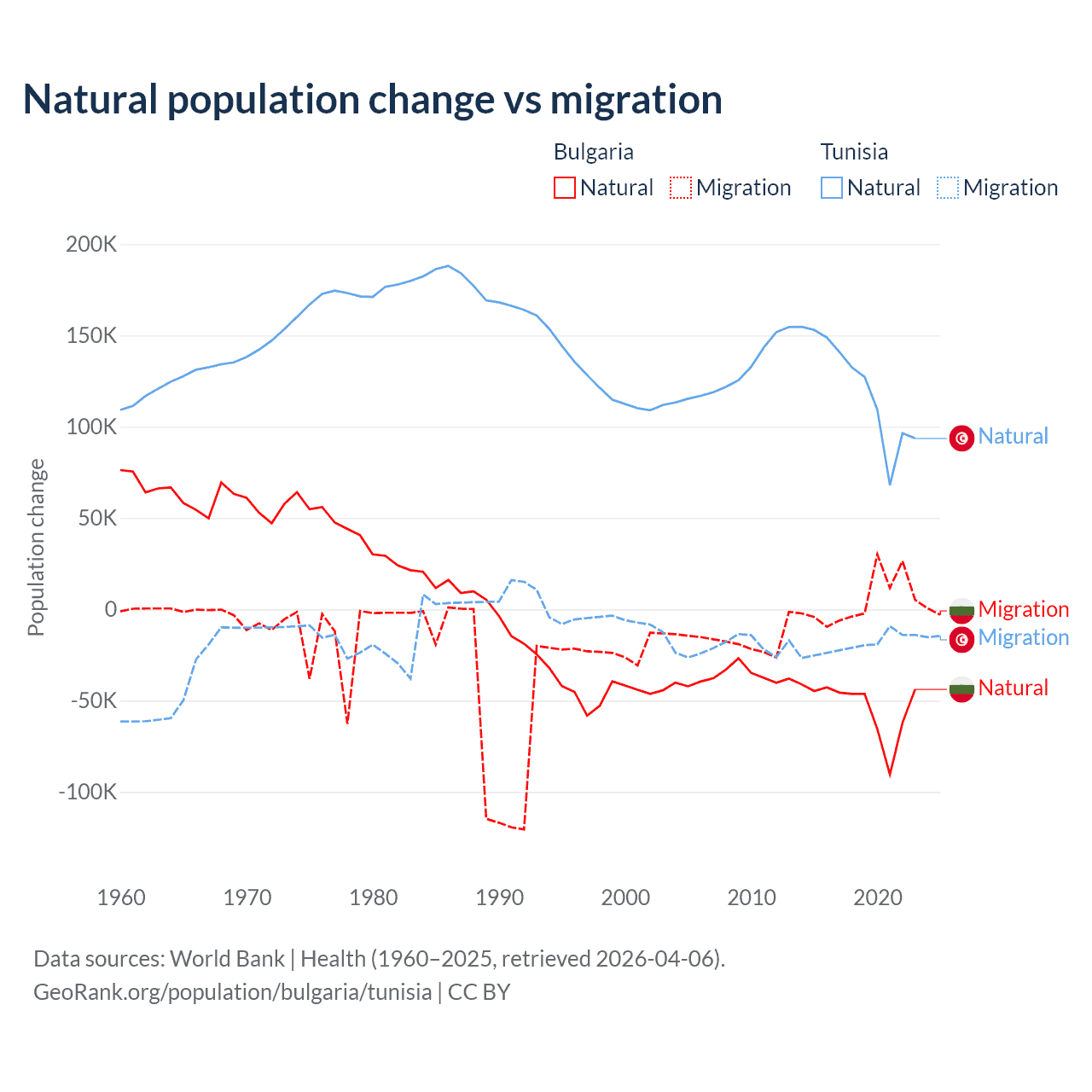 Over the last 10 years, 92.1% of the population change in Bulgaria is from natural causes (a loss of 528,535 people) and 7.94% is from migration (a gain of 45,567 people). In Tunisia 86.3% is from natural causes (a gain of 1,225,079 people) and 13.7% is from migration (a loss of 195,011 people).