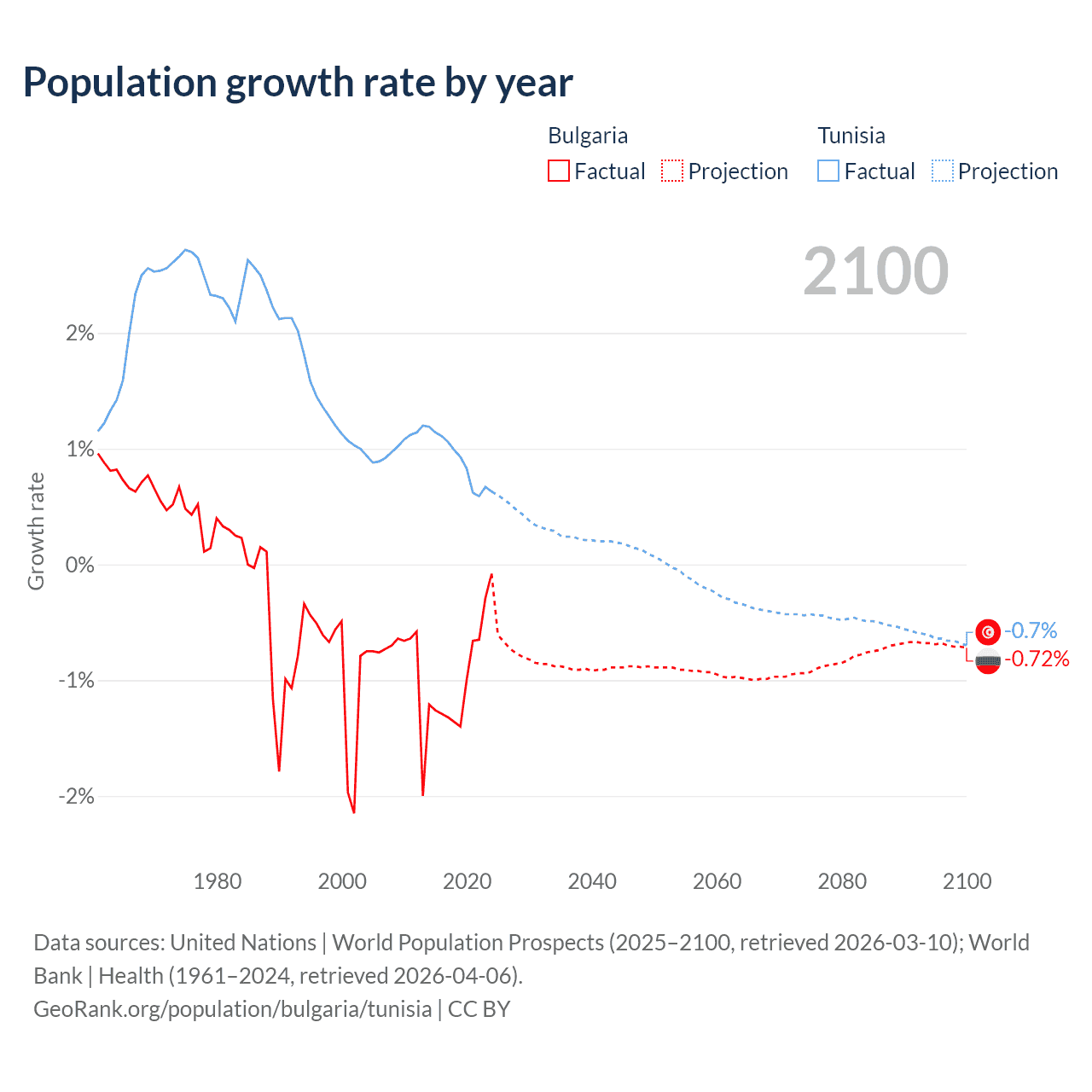 - For the last 10 years, Bulgaria has had an average growth rate of -0.96% per year vs +0.89% in Tunisia.