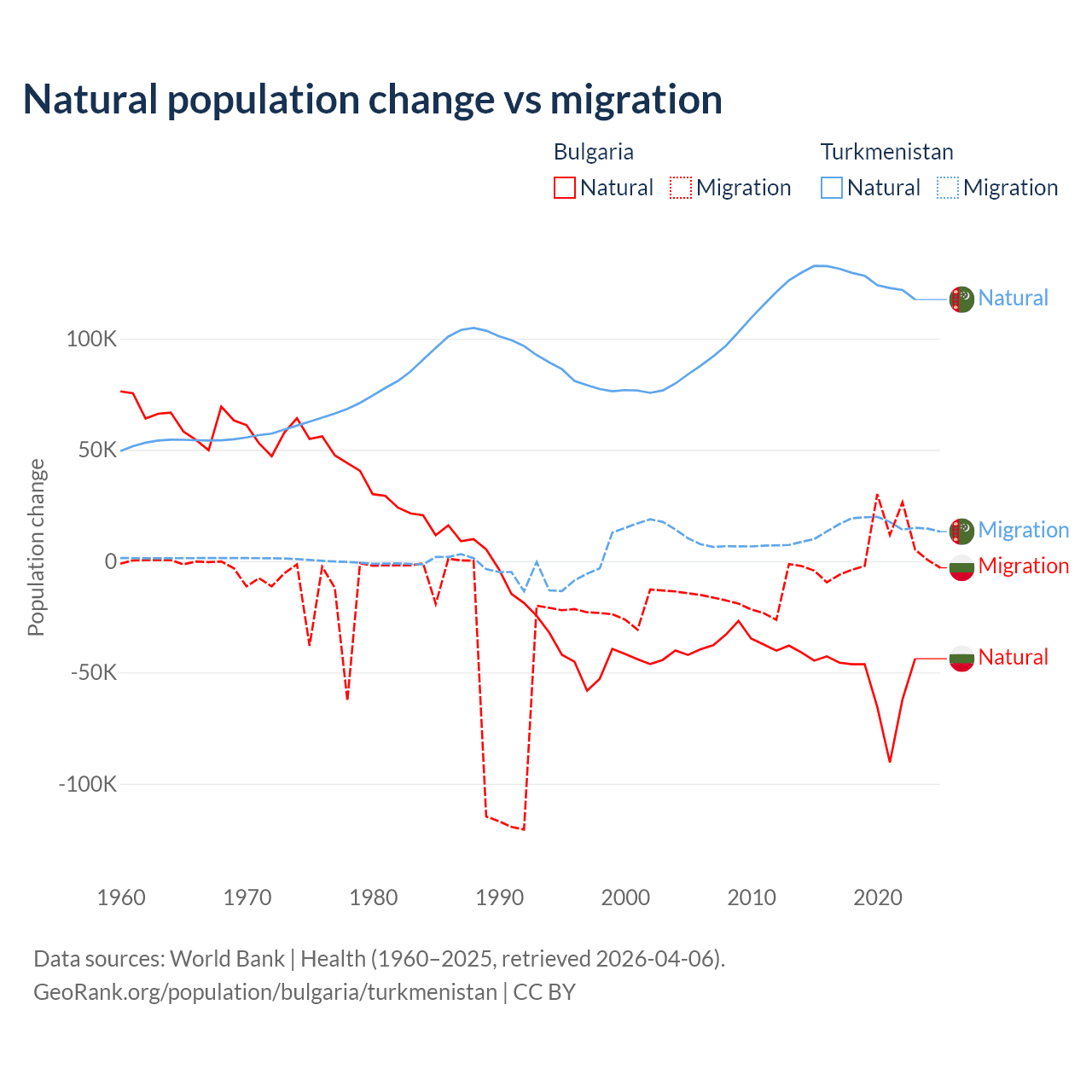 Over the last 10 years, 92.1% of the population change in Bulgaria is from natural causes (a loss of 528,535 people) and 7.94% is from migration (a gain of 45,567 people). In Turkmenistan 89.2% is from natural causes (a gain of 1,270,228 people) and 10.8% is from migration (a gain of 154,379 people).