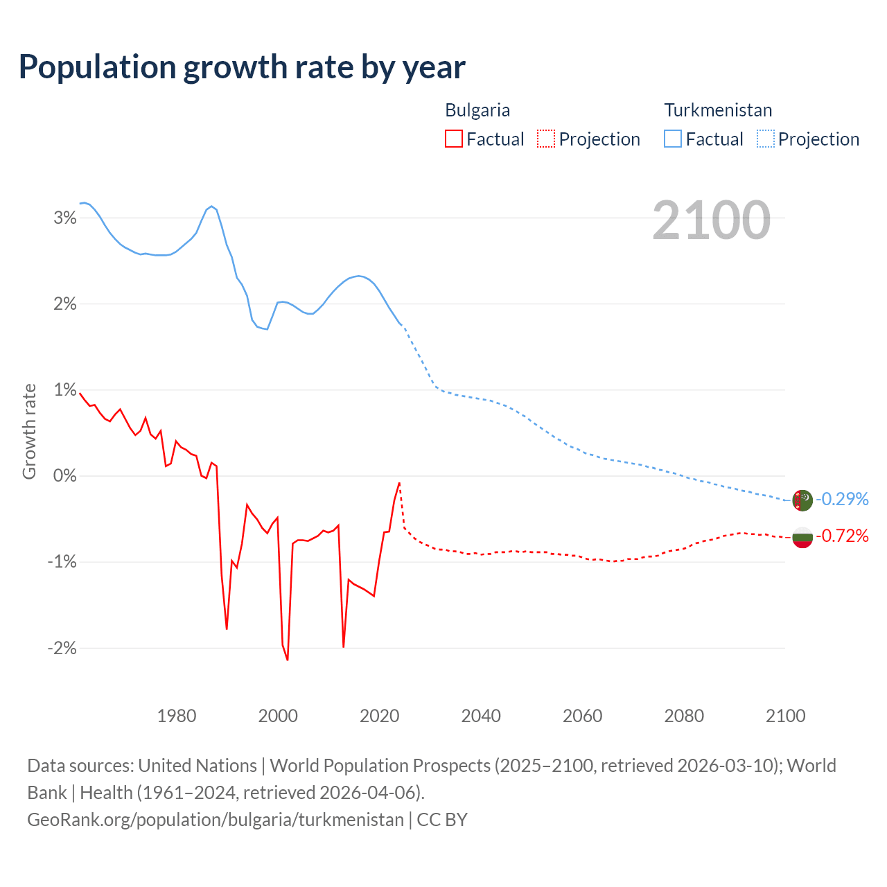 - For the last 10 years, Bulgaria has had an average growth rate of -0.96% per year vs +2.14% in Turkmenistan.