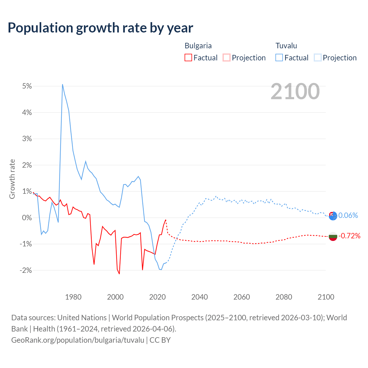 - For the last 10 years, Bulgaria has had an average growth rate of -0.96% per year vs -1.19% in Tuvalu.