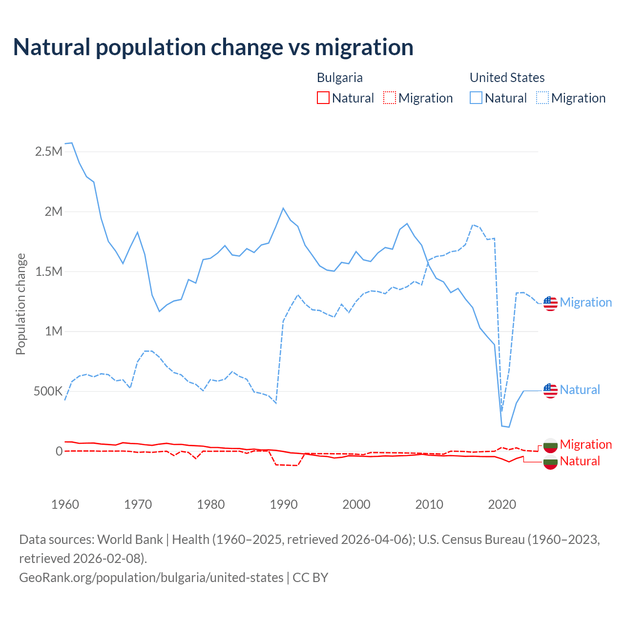 Over the last 10 years, 92.1% of the population change in Bulgaria is from natural causes (a loss of 528,535 people) and 7.94% is from migration (a gain of 45,567 people). In the United States 35.8% is from natural causes (a gain of 8,005,866 people) and 64.2% is from migration (a gain of 14,334,286 people).