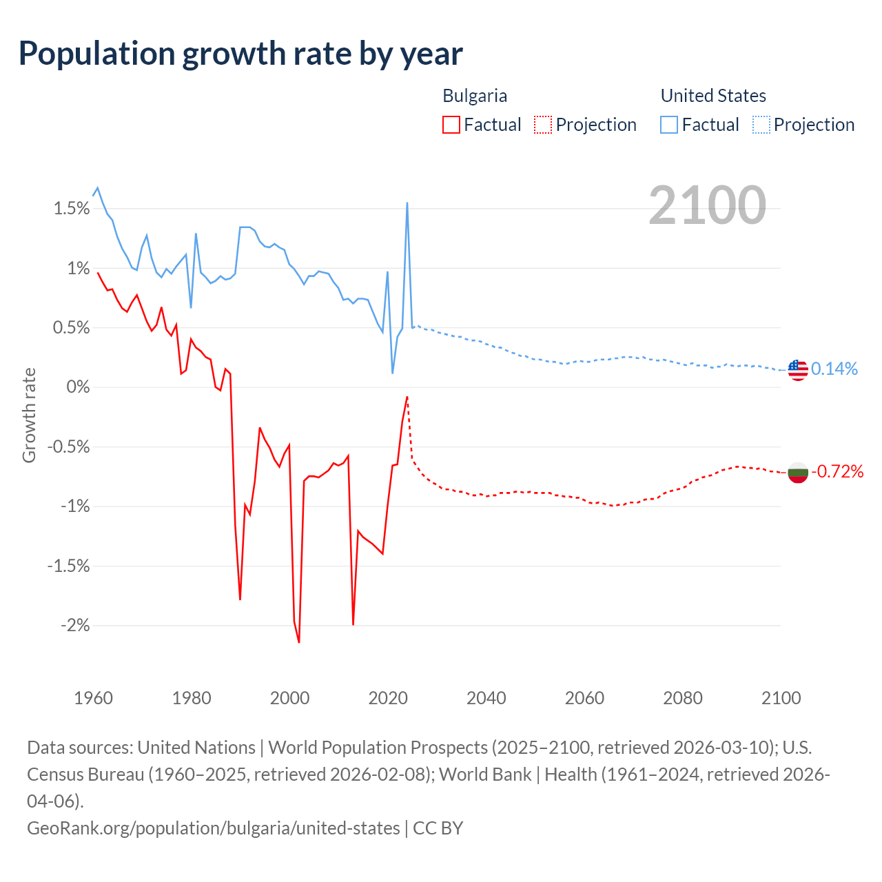 - For the last 10 years, Bulgaria has had an average growth rate of -0.96% per year vs +0.65% in the United States.